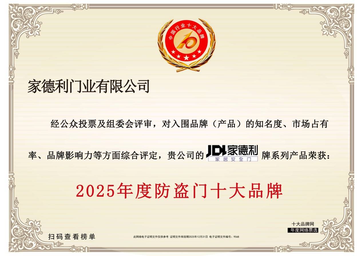 据悉,2025我国防盗门十大品牌评选以新版《防盗安全门通用技能条件》(GB17565-2022)为基准,归纳考量品牌技能专利储藏、智能制作水平、产品安全功能、商场占有率及用户满意度等多重中心维度,经过多轮苛刻挑选与威望评定终究确认榜单,旨在为商场供给科学的选购指引,推进职业向高端化、智能化、绿色化转型。家德利门业可以从中锋芒毕露,充沛显示了其在防盗门职业的归纳竞赛力。